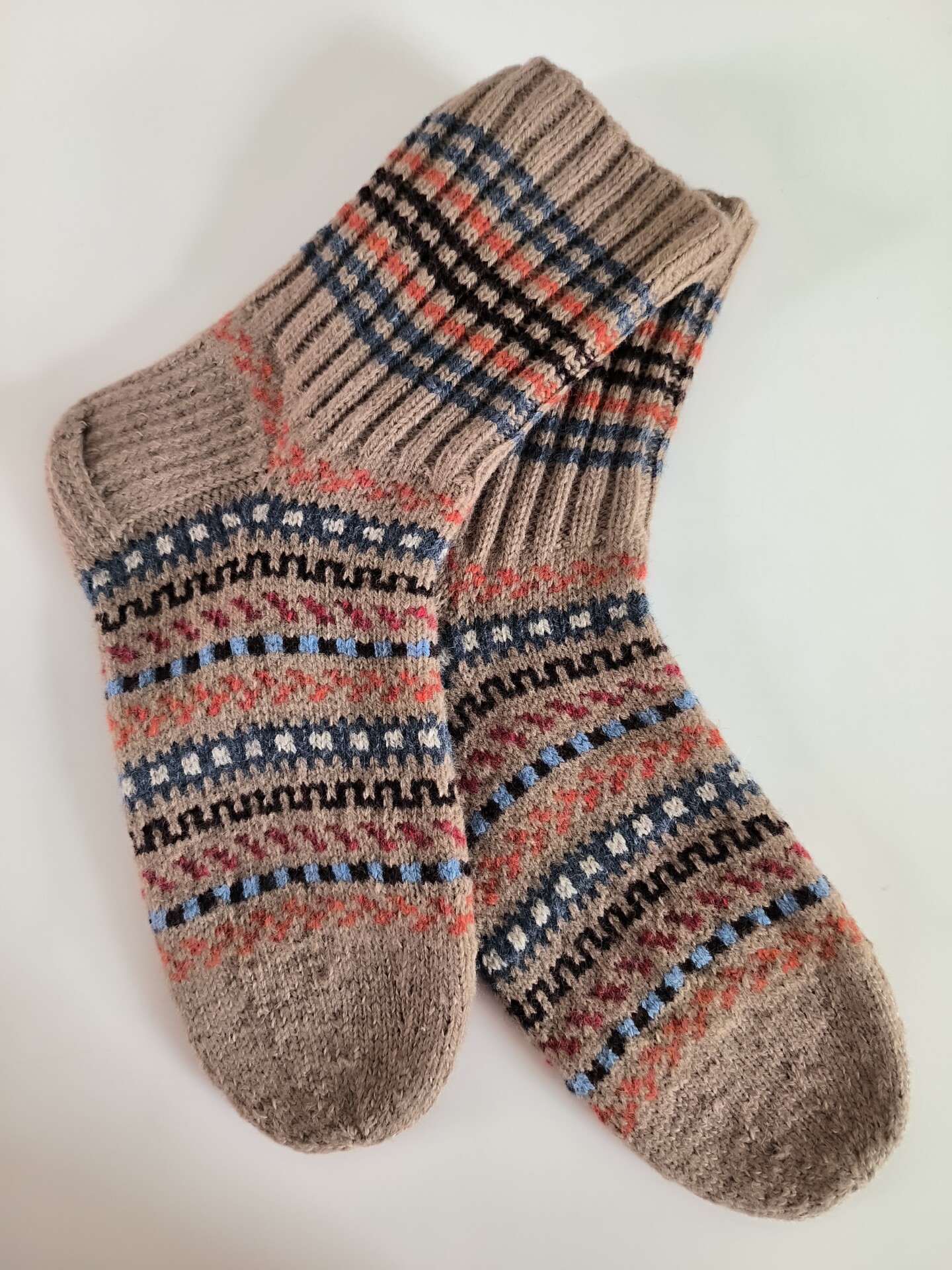 Villasest lõngast meeste sokid on kootud käsitsi varrastel. Sukkadel vahelduvad eri värvidega lihtsad kirjad triipude kaupa. Mustriga kootud sukad on vastupidavamad, soojemad ning teevad ka kandja meele rõõmsamaks.