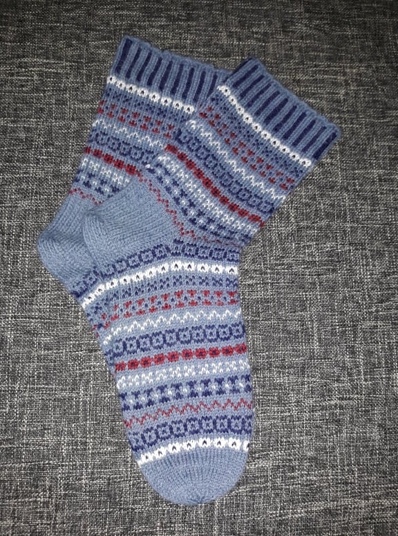 Villasest lõngast meeste sokid on kootud käsitsi varrastel. Sukkadel vahelduvad eri värvidega lihtsad kirjad triipude kaupa. Mustriga kootud sukad on vastupidavamad, soojemad ning teevad ka kandja meele rõõmsamaks.