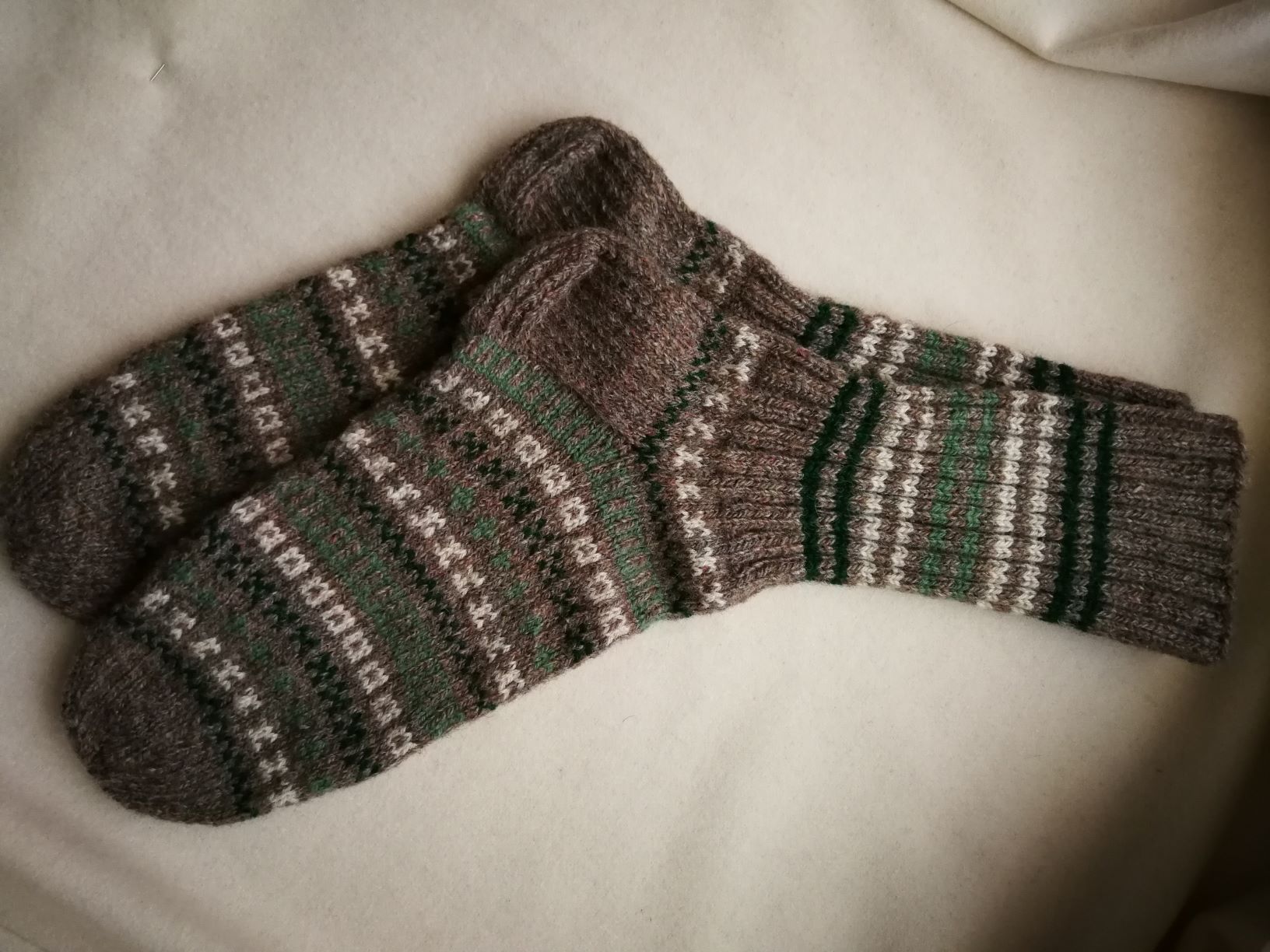Villasest lõngast meeste sokid on kootud käsitsi varrastel. Sukkadel vahelduvad eri värvidega lihtsad kirjad triipude kaupa. Mustriga kootud sukad on vastupidavamad, soojemad ning teevad ka kandja meele rõõmsamaks.