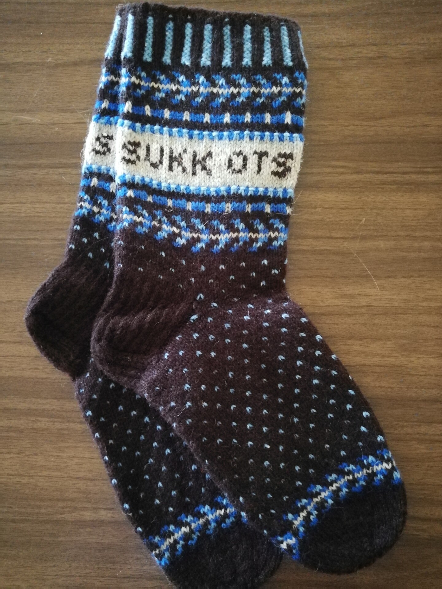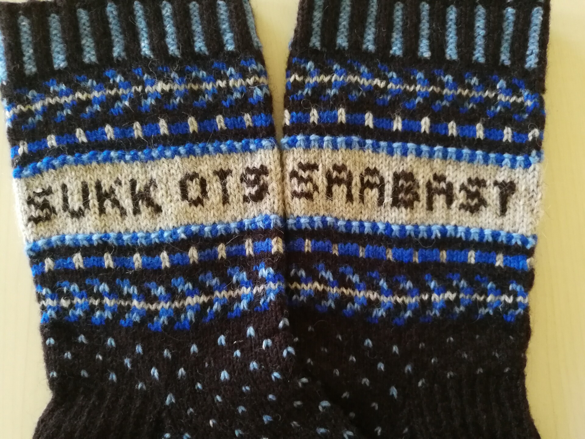 Villasest lõngast meeste sokid on kootud käsitsi varrastel. Sokkidel on võrukeelne tekst, mis annab teada, et sokk on saapa jaoks mõeldud. Mustriga kootud sokid on vastupidavamad, soojemad ning teevad ka kandja meele rõõmsamaks.